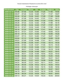 اوقاط شرعی اوقات شرعی شهر های مختلق فنلاند Rukousajat – Shia Rukousajat (Shiialainen) Helsinki Helsinki Espoo Vantaa Tampere Turku Oulu Lahti Jyväskylä Kuopio Joensuu Pori Vaasa Rovaniemi Lappeenranta Hämeenlinna Kotka Seuraava rukous – --:--:-- Soita adhan اوقاط شرعی هلسینکی برای ماه رمضان اوقات شرعی به افق مکه مکرمه 🕋 Rukousajat – Mecca Fajr05:30 Dhuhr12:34 Asr15:53 Maghrib18:22 Isha20:22 Laskentamenetelmä: Umm al-Qura (Mecca)